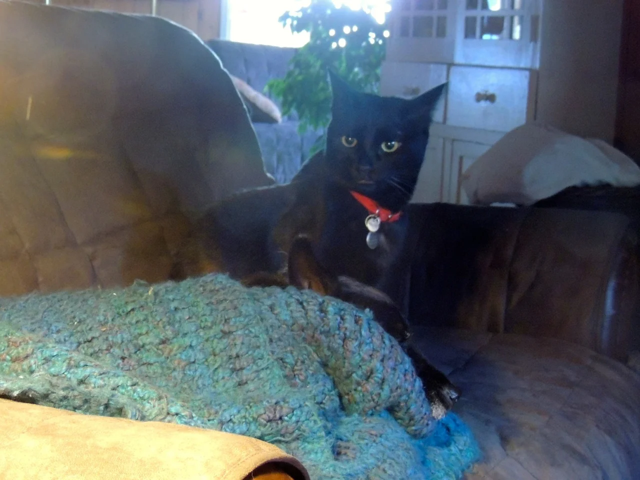 ...the cat comes and unwraps her like a big present. Oh, that face full of mischief.