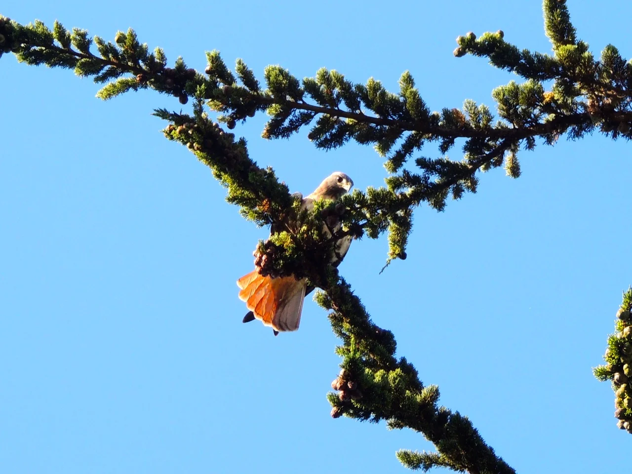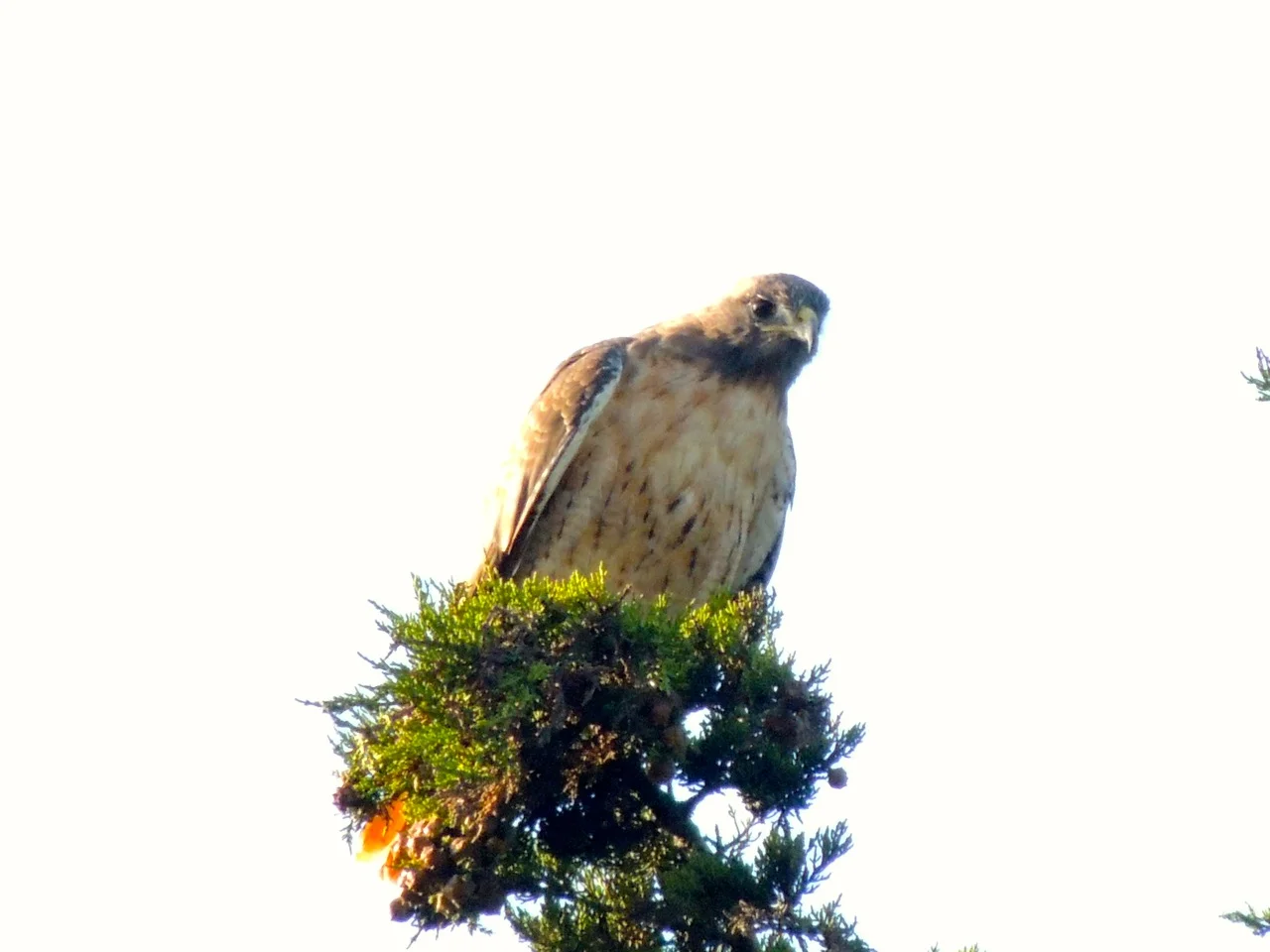 This is the second day in a row this hawk sat in the tree over my house, calling. (Two photos of him.)