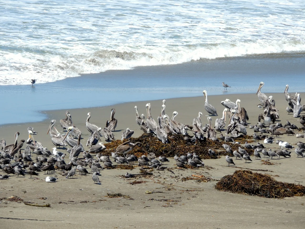 Note the hierarchy. The big pelicans get to sit up front. Little gulls at the back.