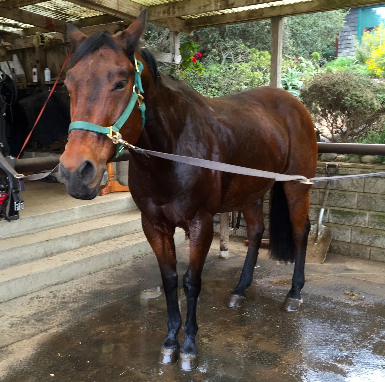 He got surprisingly sweaty on our Back Bay trail ride, and needed a good hosing down afterward. Probably because his winter coat is coming in but it's still hot.