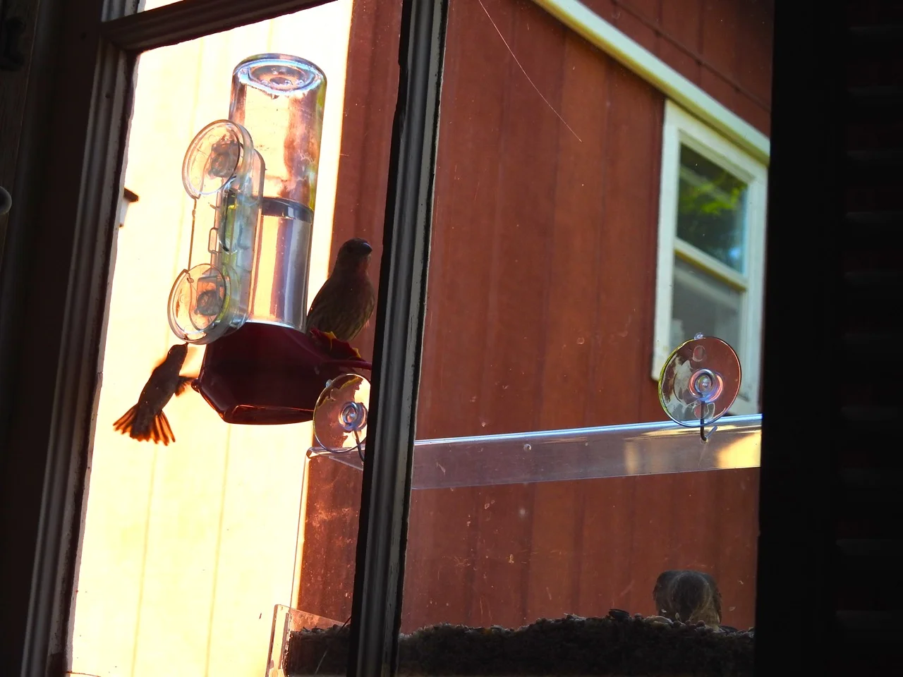 A finch uses the hummingbird feeder as a waiting area (because there's a larger bird in the seed feeder) while a hummingbird calmly works around him.