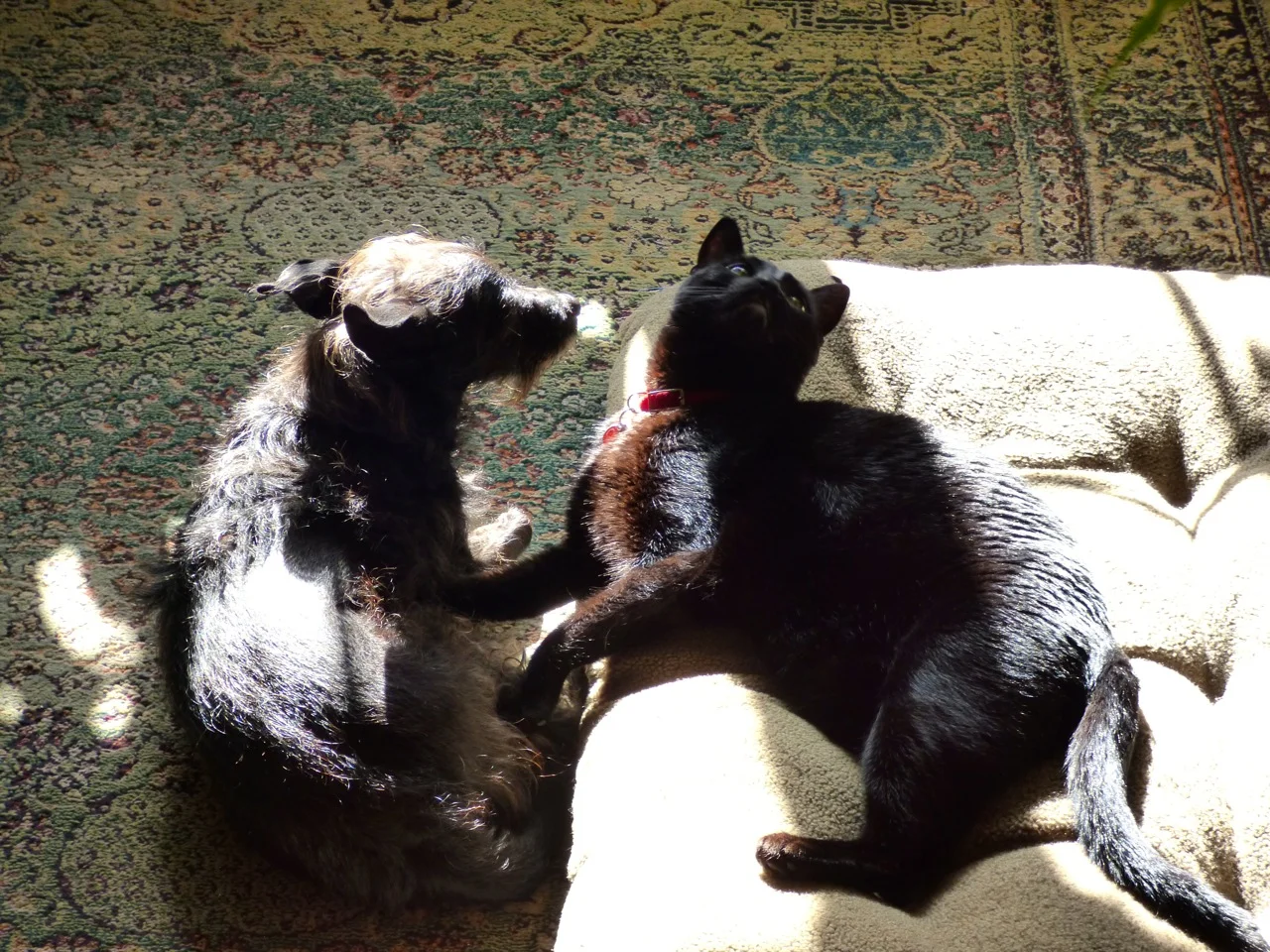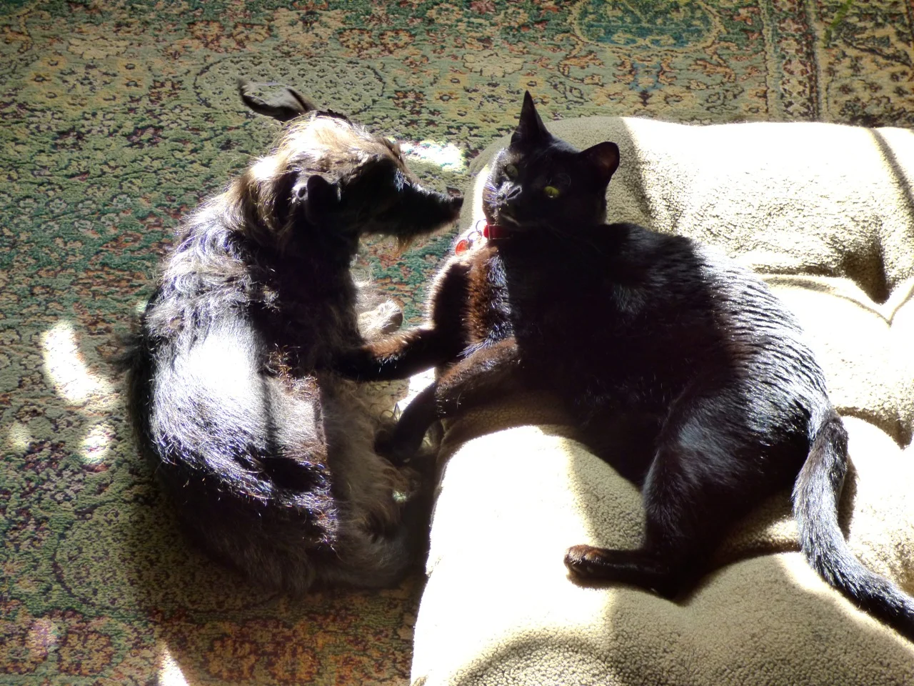 Notice both of the cat's front paws purposely on the dog. And I have no idea what he's looking at in the third shot. Three photos.