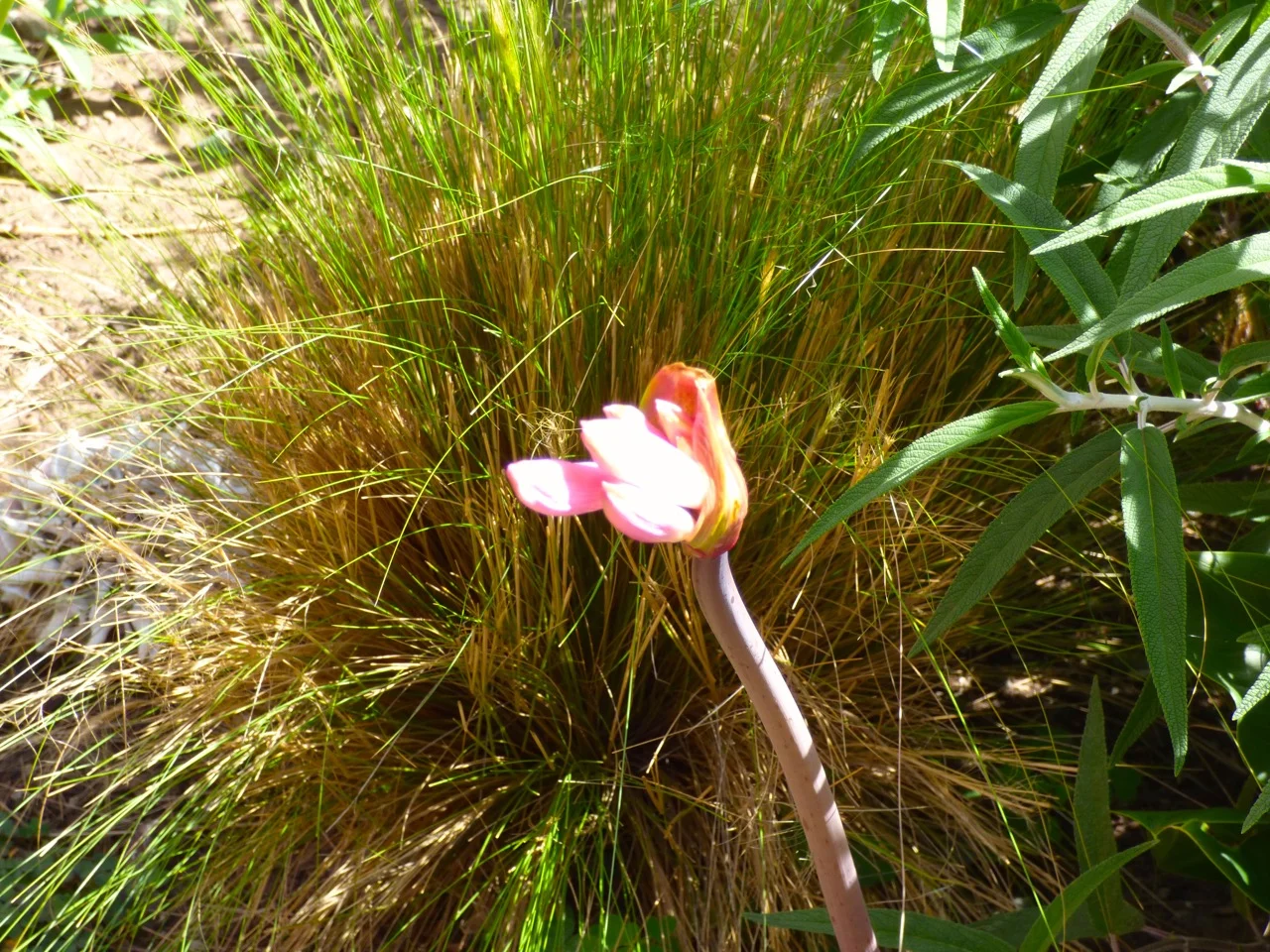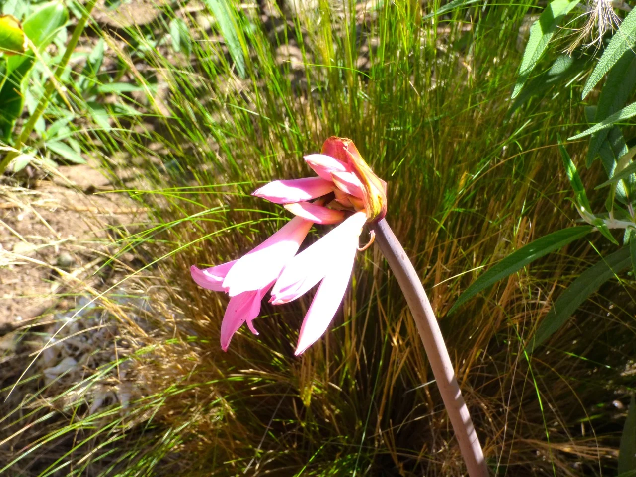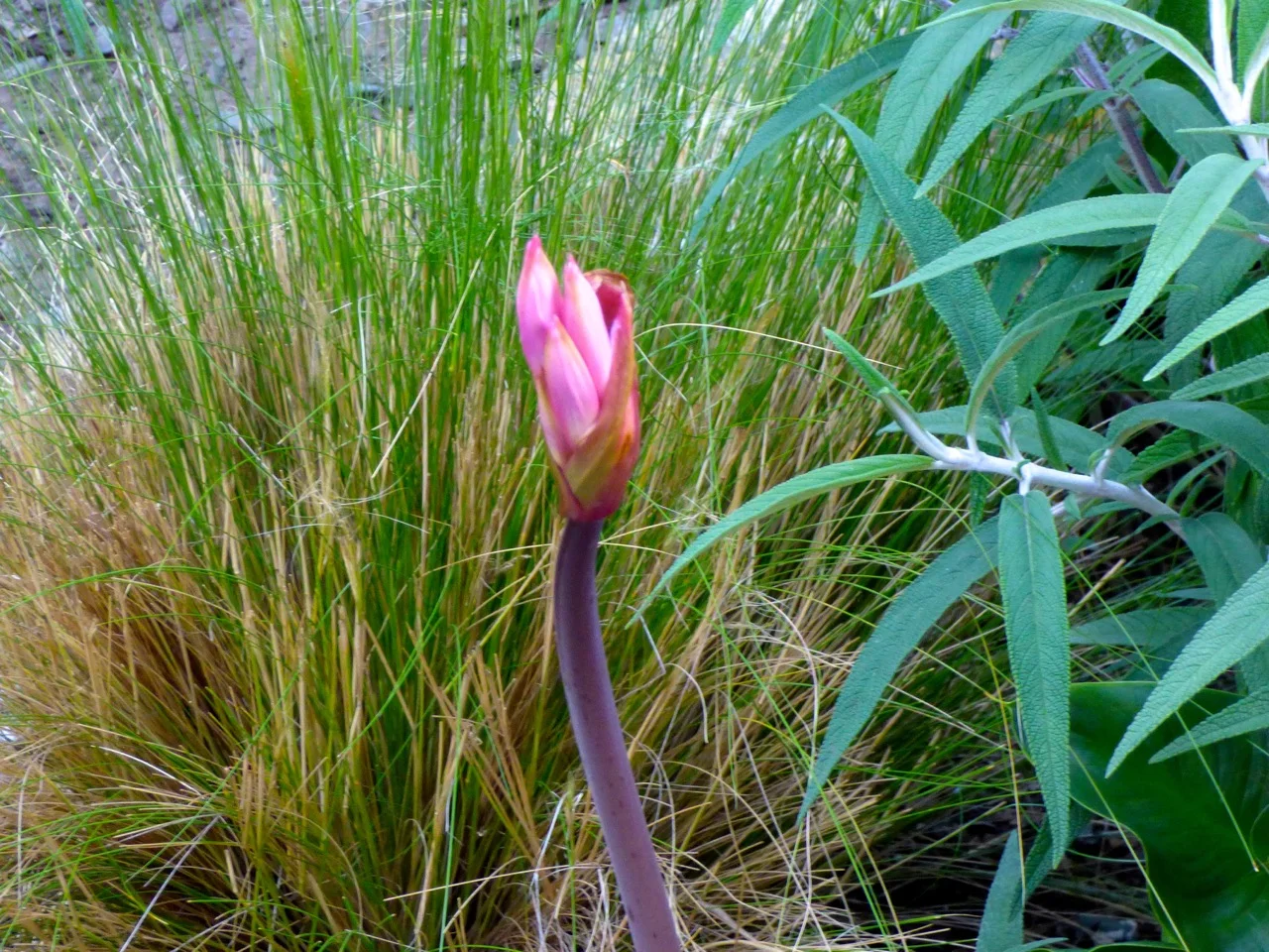 A Naked Lady bud blooms in my garden in three photos taken over about one and a half days.