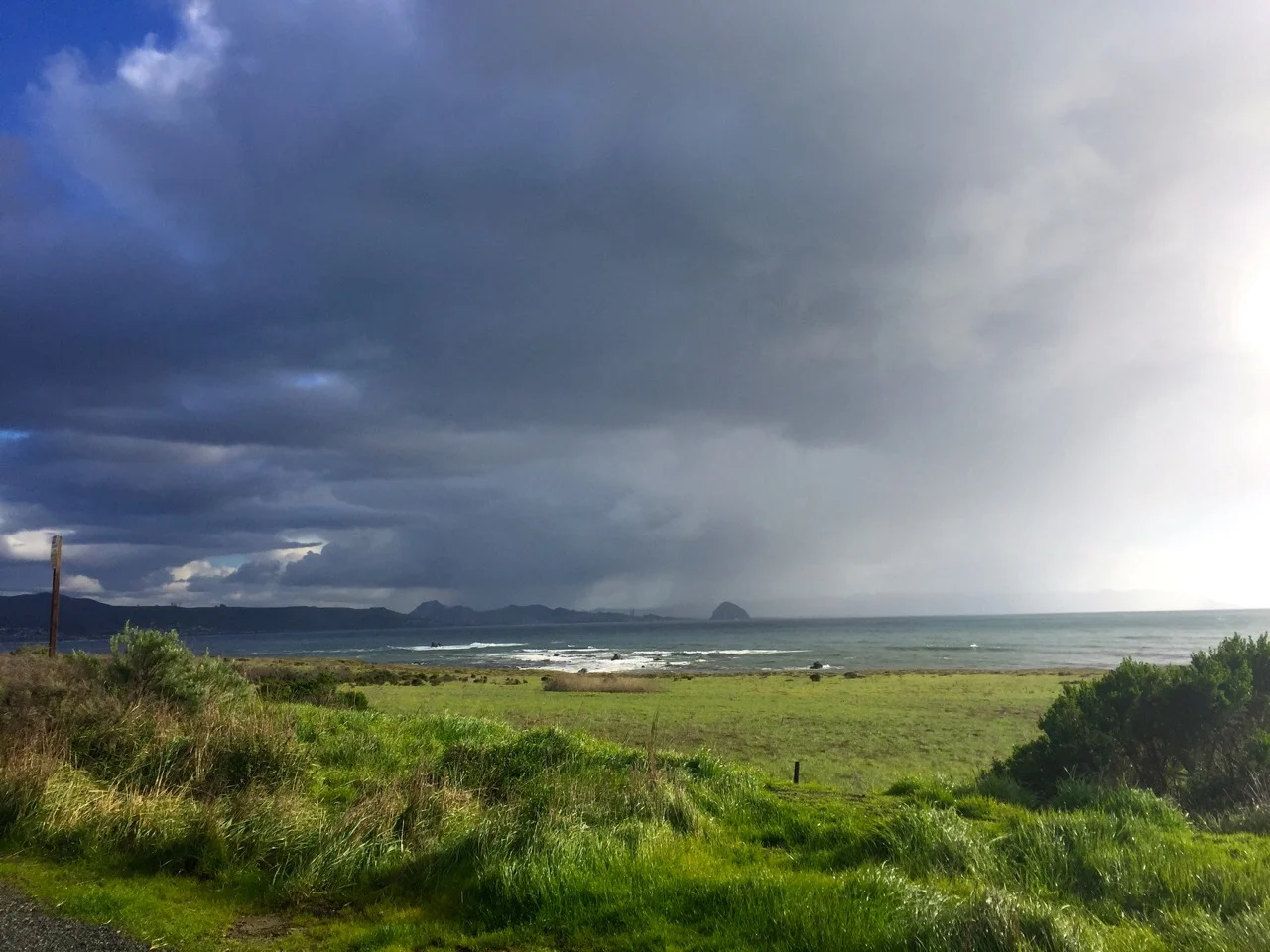 Looking back from sunny Cayucos to a very rainy Morro Bay.