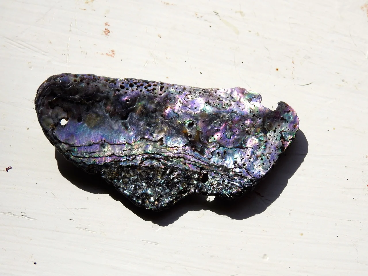The colors in a piece of abalone shell from San Simeon Cove.